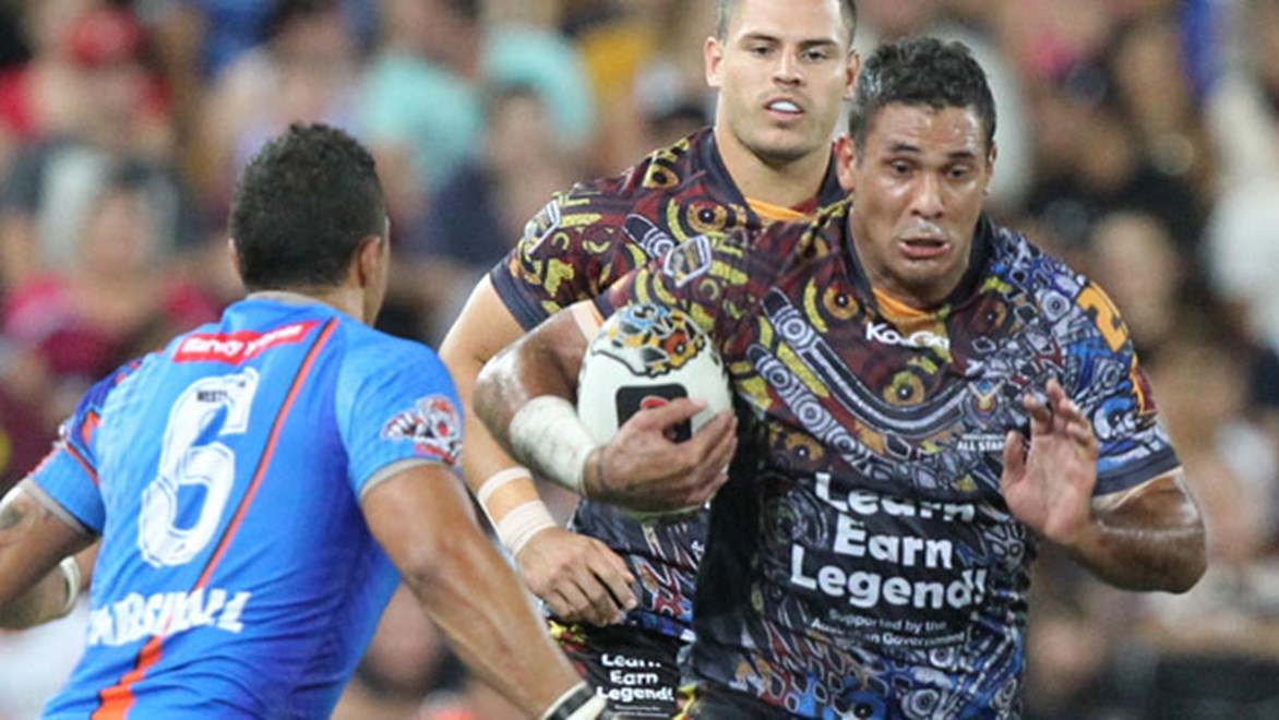 Justin Hodges on the charge for the Indigenous All Stars in the last All Stars game played in 2013 in Brisbane.