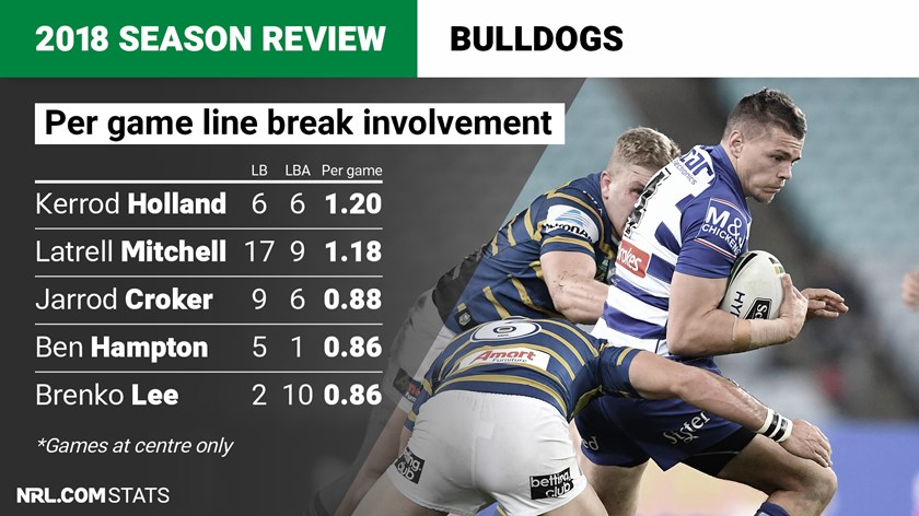 Overall in 10 starts at centre, Holland managed the best per-game line-break involvement of any centre in 2018, fractionally ahead of the year's best centre, Latrell Mitchell. Six breaks and six line break assists, for a 1.20 per-game involvement, just edged Blues and Kangaroos centre Mitchell's 1.18 (17 breaks and nine assists in 22 games).