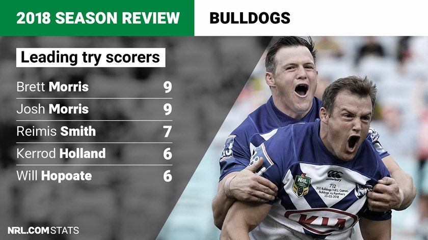 The Bulldogs were one of a handful of teams in which no player cracked double figures for tries. The Morris twins, Brett and Josh, were best with nine apiece and neither will be at Belmore in 2019. The encouraging sign is that the next two names on the list – Reimis Smith (seven in 11 games) and Kerrod Holland (six tries in 20 games, but five in 10 games after switching to centre) were both standouts over the more positive closing stages of 2018.