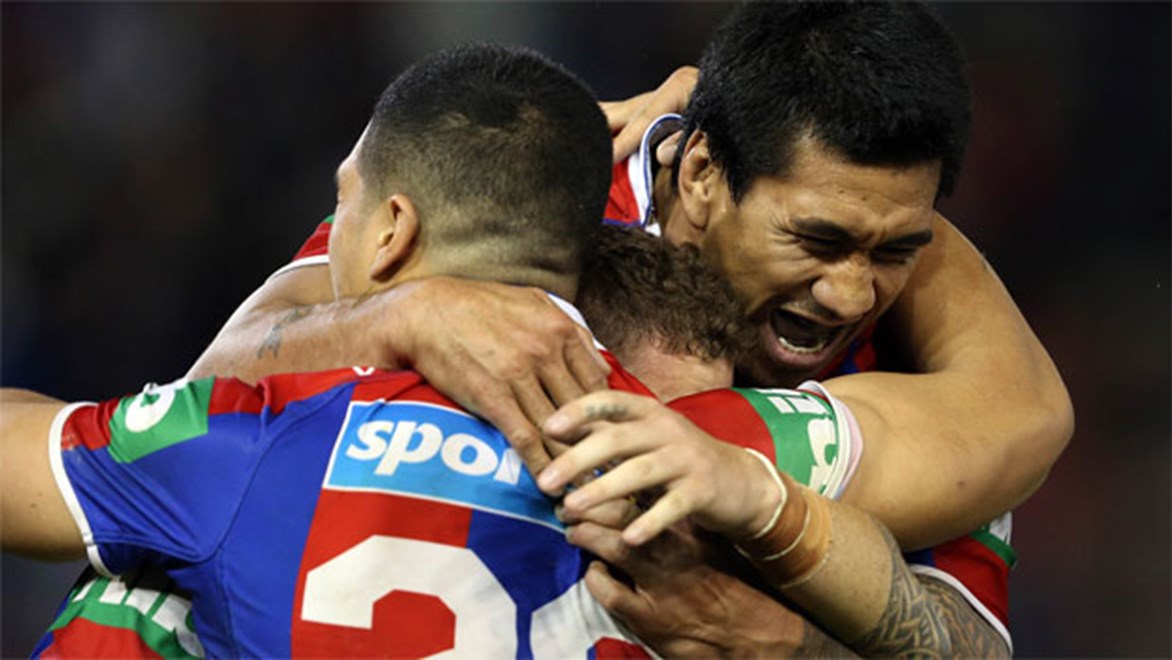 The Newcastle Knights celebrate their shock win over the Roosters on Friday night.