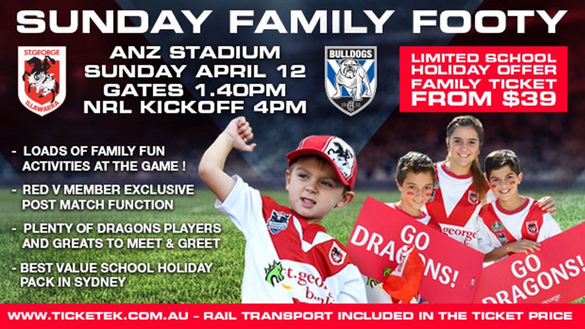 The St George Illawarra Dragons and Canterbury-Bankstown Bulldogs are celebrating the school holidays with a special Family Ticket offer for their NRL Telstra Premiership match at ANZ Stadium, Olympic Park on Sunday!