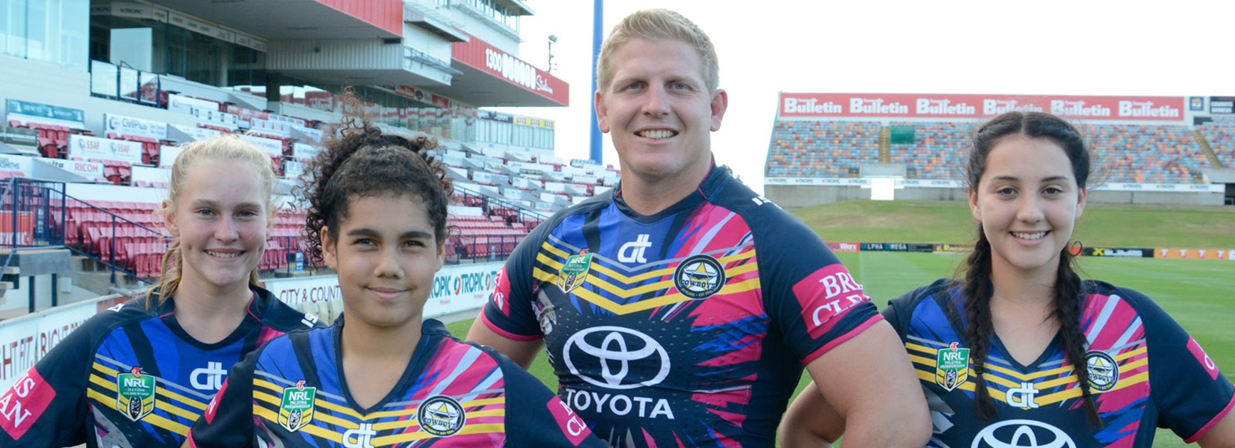 Prop Ben Hannant models the Cowboys' Women in League jersey along with Townsville under-14 players Erin Tremblett, Izabella Kennedy and Maddison Craigie.