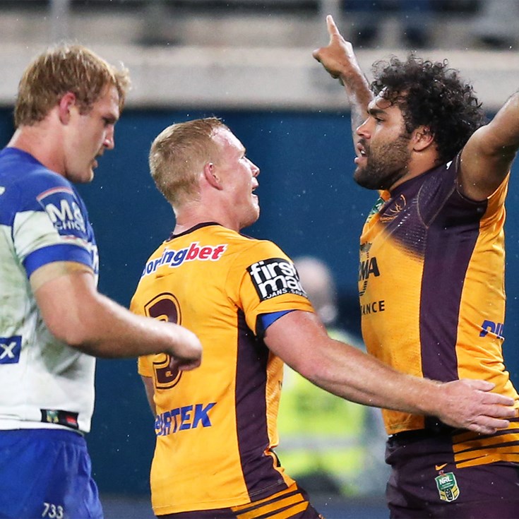But with the Broncos reasserting ascendency and the Bulldogs' few attacking chances breaking down, it was Brisbane who managed to regain the lead when a long Andrew McCullough pass followed by an Anthony Milford short ball allowed a wide-running Sam Thaiday to slice through to the outside of towering youngster Shaun Lane.