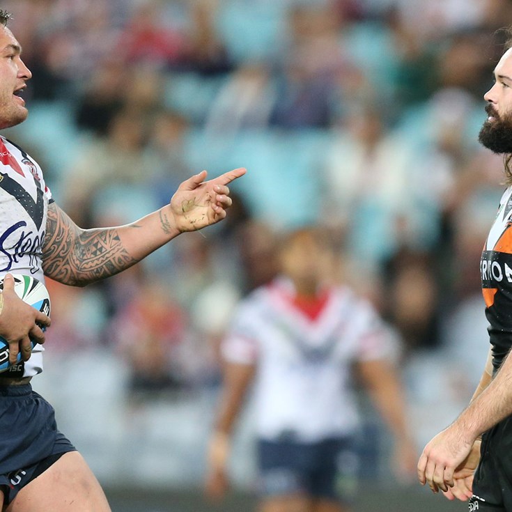 Tiger tempers started to fray late in the game with fiery lock Marty Taupau launching a cheap swinging arm on Roosters five-eighth James Maloney as he was lying on the ground, prompting players to run in and earning himself a sin-bin for the final few minutes of the game.