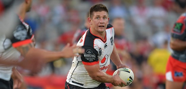 The home side then scored a further two tries in the space of four minutes to take the lead. First Simon Mannering took a Kieran Foran pass over the line before Blake Ayshford's 'alley-oop' style pass created a gap for Thompson to grab his second and make it 16-6 at the half-time.