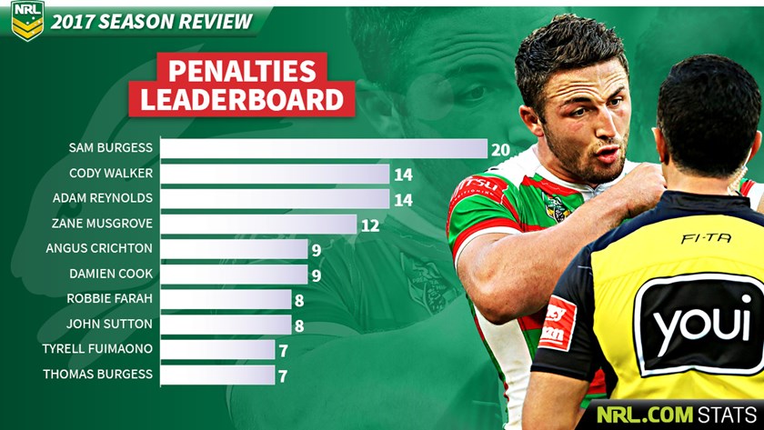 No-one can question the commitment of South Sydney skipper Sam Burgess. But the one downside of his efforts was the fact he gave away 20 penalties, which was the eighth-highest total of any NRL player.