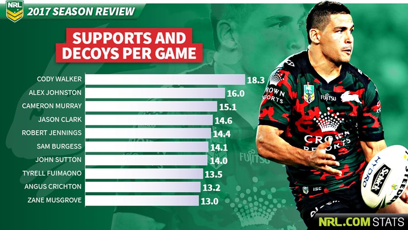 A large part of the reason why Alex Johnston scored 22 tries was his superb support play. He finished second behind teammate Cody Walker in this category.