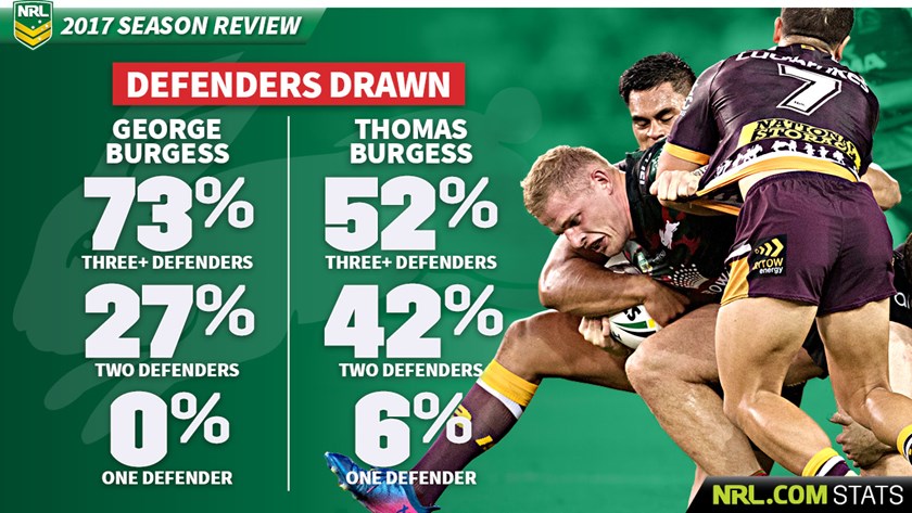 In information provided by NRL.com/stats, rival teams didn’t think trying to bring down big bopper George Burgess with one defender was a good idea. He led the league in this category but was the only Souths player in the top 30.