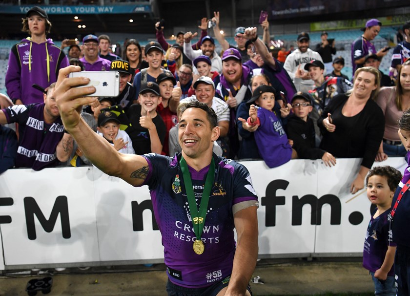Billy Slater poses with fans after the 2017 NRL Grand Final.
