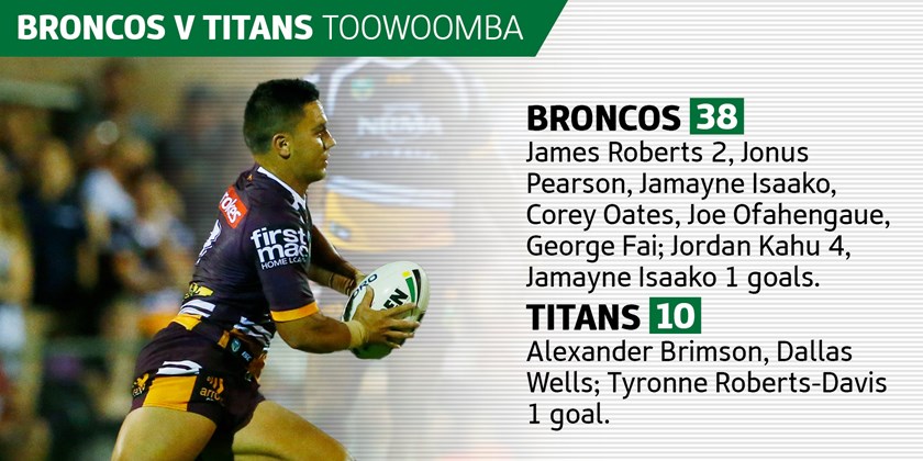 After 32 minutes the Broncos moved to 20-0 through a try to fullback Isaako who broke through the Titans defence on the left edge from 20 metres, with the try converted by Jordan Kahu.