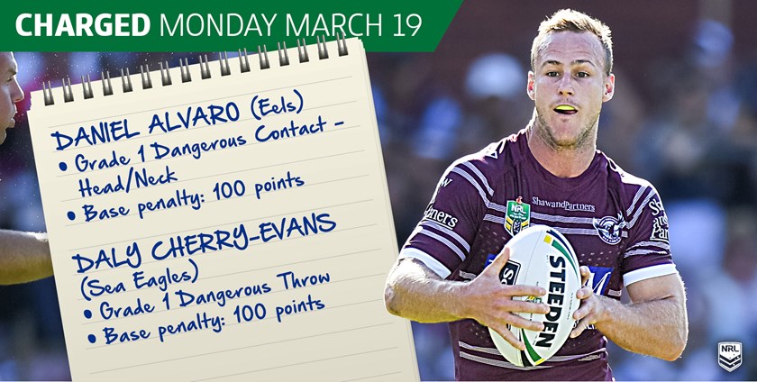 Parramatta prop Daniel Alvaro and Manly halfback Daly Cherry-Evans have both been charged by the match review committee from the Sea Eagles' win over the Eels on Sunday, although both can avoid suspension with early guilty pleas.