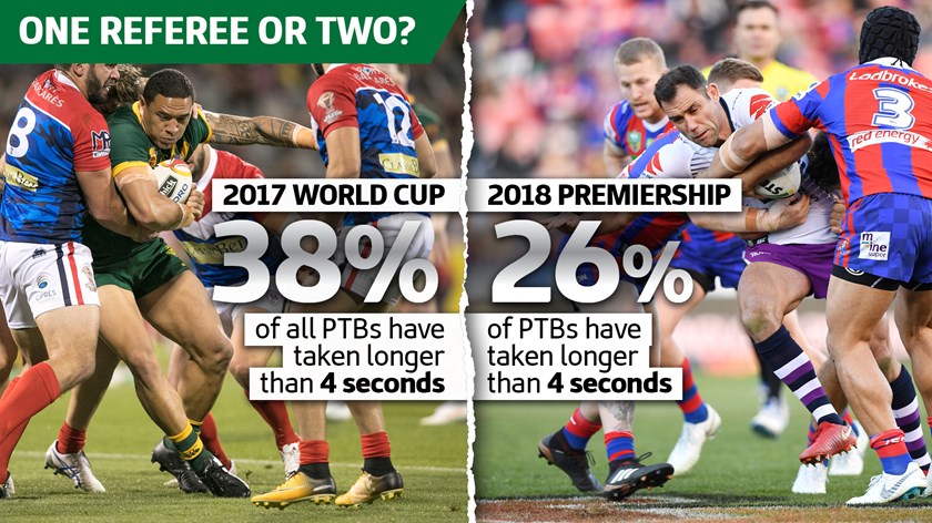 Figures obtained by NRL.com show that during last year's World Cup 38 per cent of all play-the-balls were classed as "very slow" and took more than four seconds to complete under the one referee system.