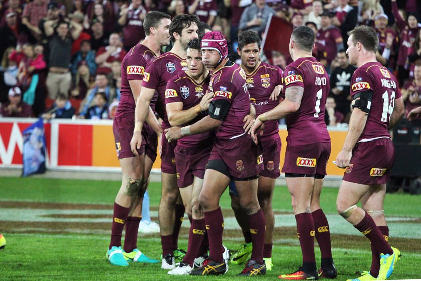 Former Maroons teammates Cooper Cronk and Johnathan Thurston share one of many happy moments in the Origin arena.