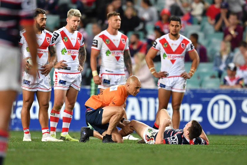 Roosters five-eighth Luke Keary goes down injured in round 20 against the Dragons.