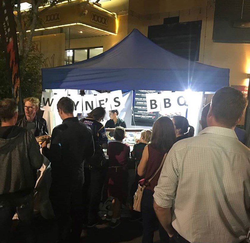 A hot food stall on iconic Caxton Street had a banner up saying "Wayne's BBQ" while the Broncos were in the process of thumping the Rabbitohs 38-18 a few hundred metres away at Suncorp Stadium.