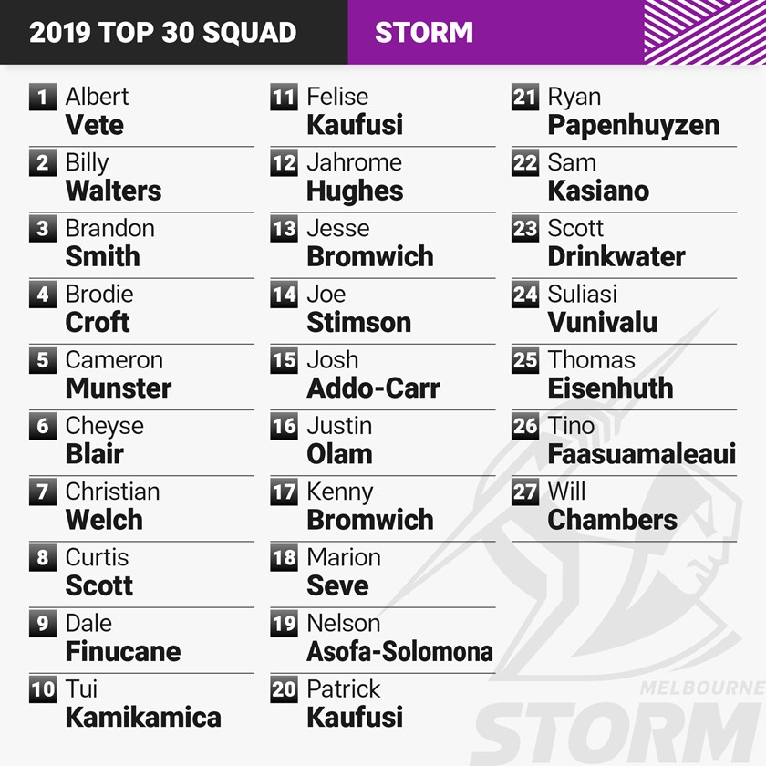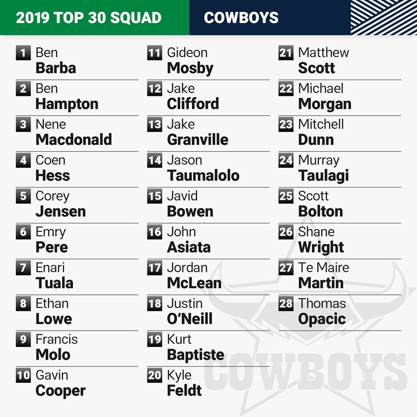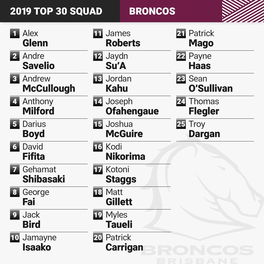 (Players who have dropped out of 30-man squad from 2018) Corey Allan (Rabbitohs), Sam Thaiday (retired), Thomas Opacic (Cowboys), Korbin Sims (Dragons), Jonus Pearson (Dragons), Mosese Pangai, Sam Tagataese, Corey Oates, Matt Lodge, Tevita Pangai jnr.
