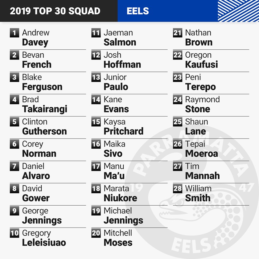 The absence of off-contract star Jarryd Hayne from the top-30 list headlines a number of absentees from last year. Beau Scott has retired, Tony Williams, Siosaia Vave, Nathan Davis, Kirisome Auva'a and Cam King have been released. Inbound are forward reinforcements Junior Paulo and Shaun Lane plus a much-needed boost on the wing in the shape of Blake Ferguson. Two of last season's debutants have earned an upgrade. Young hooker Reed Mahoney, who played first grade last season, has been retained as a development player.