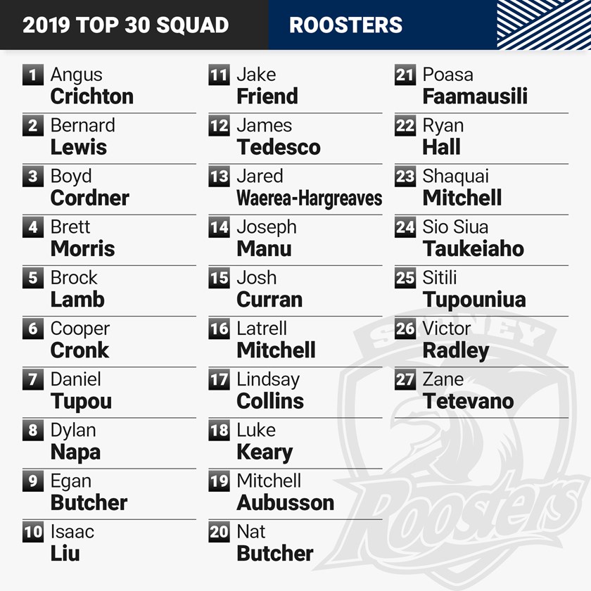 (Players who were not in 30-man squad from 2018) Sean O'Sullivan (Roosters), Kotoni Staggs, Myles Taueli, Patrick Carrigan, Thomas Flegler.