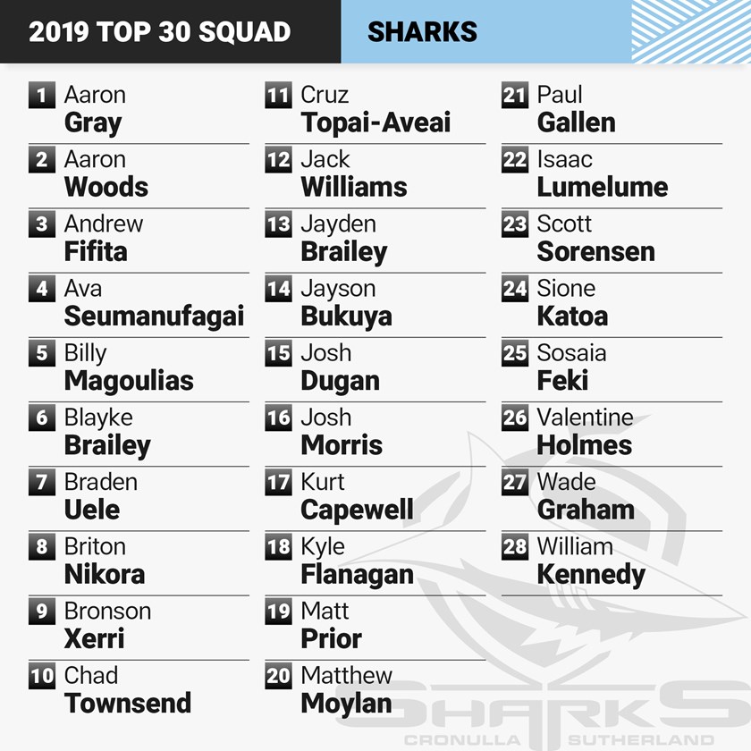 The off-contract James Segeyaro's future hasn't been sorted but it appears not to be at the Sharks with Blayke Brailey's promotion to the NRL squad. Josh Morris is effectively a straight swap for Jesse Ramien – Morris is the only one of the five new names not to be a promotion from the Sharks juniors. Edrick Lee, Joe Paulo, Ricky Leutele, Kurt Dillon and the retired Luke Lewis are the other major outs. Cronulla have 28 of their top 30 spots sealed for 2019.