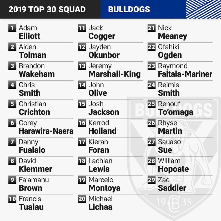 The Bulldogs have 29 of 30 spots filled (though could yet free up a spot and some cash if David Klemmer is granted a release) and the club believes they have a good mixture of experience and youth. Three of last season's top 30 spots were filled by already departed players James Graham, Lloyd Perrett and Sam Kasiano, but the club will no longer be paying those players for 2019. There has been a significant overhaul otherwise with six up-and-coming players signed from other clubs - such as Nick Meaney, Jack Cogger, Sauaso Sue, Corey Harawira-Naera and Christian Crichton - and some senior players – headed by the Morris twins and Greg Eastwood – departing. The Dogs are confident Kieran Foran is fit again and will help mentor talented halves partner Lachlan Lewis, while Josh Jackson will again captain the side as he looks to push his claims for a return to the NSW side.