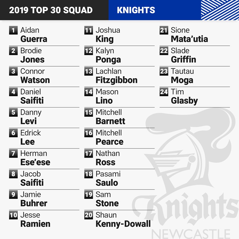 The Knights are finally reaping some rewards from a few seasons in the doldrums, with a few front-loaded contracts given them a stack of wiggle-room for 2019 with just 24 players currently locked in and loads of room in the salary cap. Expect plenty more movement between now and round one for Newcastle but at this stage youngsters Nick Meaney, Jack Cogger, Brock Lamb, Cory Denniss, JJ Felise and Luke Yates are unsigned or departing, along with retiring veterans Chris Heighington and Jacob Lillyman. Pat Mata'utia and Ken Sio have also departed with Tim Glasby, Edrick Lee, Jesse Ramien, Zac Woolford and Mason Lino the new recruits. Tom Starling is also unsigned.