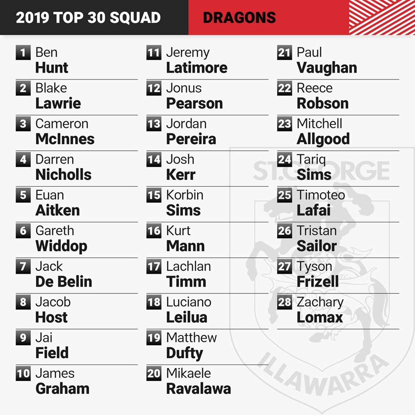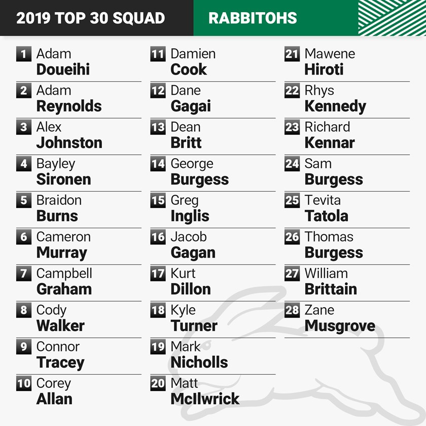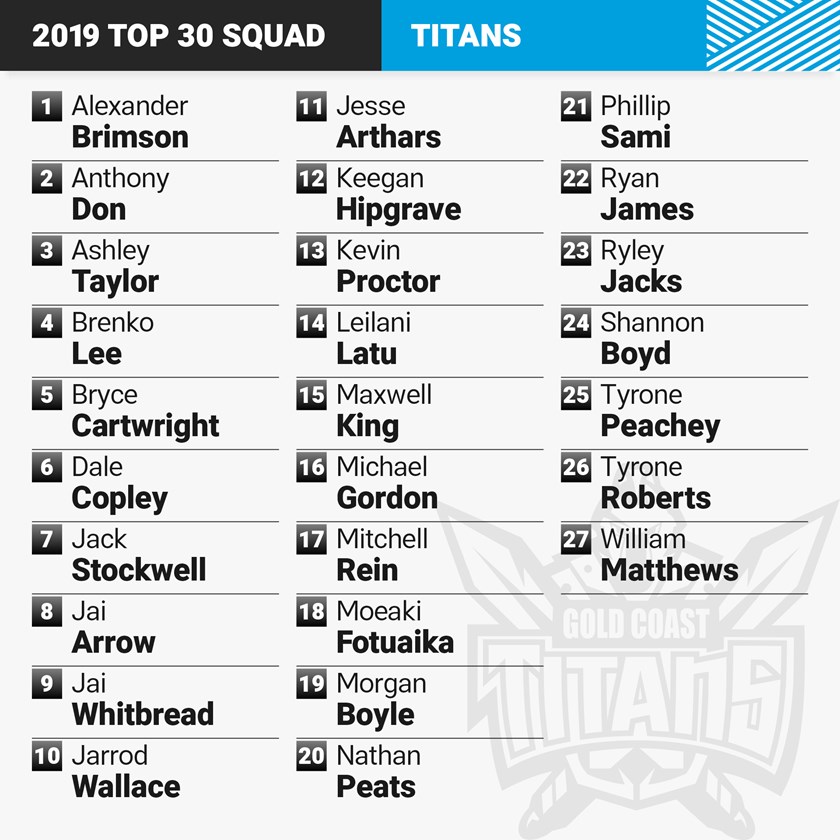 (Players who have dropped out of 30-man squad from 2018) Corey Allan (Rabbitohs), Sam Thaiday (retired), Thomas Opacic (Cowboys), Korbin Sims (Dragons), Jonus Pearson (Dragons), Mosese Pangai, Sam Tagataese, Corey Oates, Matt Lodge, Tevita Pangai jnr.