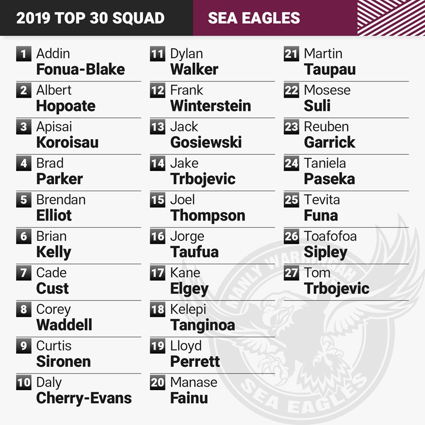 Manly have released all three Wrights (Jono, Matt and Tom) from their top squad along with Lewis Brown and Aku Uate. Lachlan Croker drops from the NRL to the development squad while the club will no longer be paying retired prop Nate Myles in 2019 after carrying a portion of his contract on the books last season. Shaun Lane has been poached by Parra. Inbound is Titans pair Kane Elgey and Brendan Elliott plus a few promotions from the lower grades. Trent Hodkinson and Semisi Kioa are not listed in their top squad as of November 1 but it is believed their contracts will be ratified by the NRL in the next few weeks.