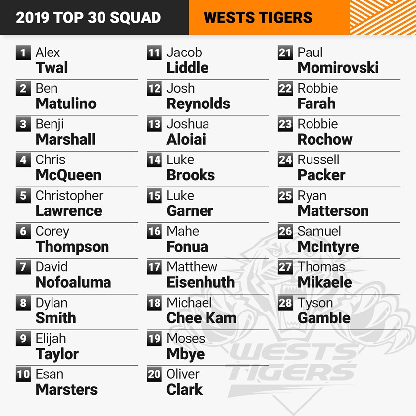 The Tigers have a fairly settled roster after a big upheaval over the previous 12 months. The departures of Tui Lolohea, Kevin Naiqama, Tim Grant and Jesse Sue have been known for some time while the club previously announced three rookies would be joining the top 30 alongside recruits Ryan Matterson and Paul Momirovski. There are two spots still open in the top 30.