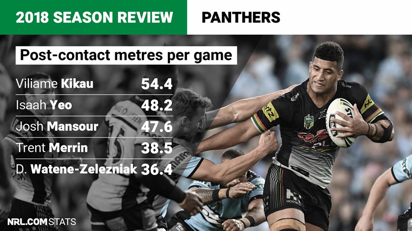 It's no surprise powerhouse forward Viliame Kikau led the club for the most post-contact metres per game, averaging 54.4 metres – just short of the Telstra Premiership's top 10. Aaron Woods was 10th on the list after averaging 54.7 during his stints with Canterbury and Cronulla.