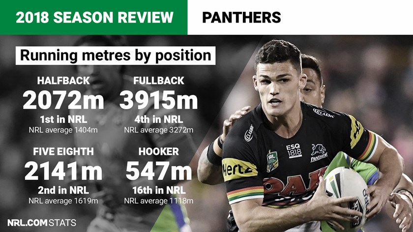 Penrith tallied the most metres from halfback (2072m) and the second-most metres from five-eighth (2141m) – this workload was spread across Maloney, Cleary and Peachey. Maloney's biggest running game was against Gold Coast in round six when he registered 211 running metres at halfback and in the same game Peachey who was five-eighth reached his highest running metres in the position (196), while Cleary hit a top of 135 running metres in round 24 against the Parramatta Eels at halfback.