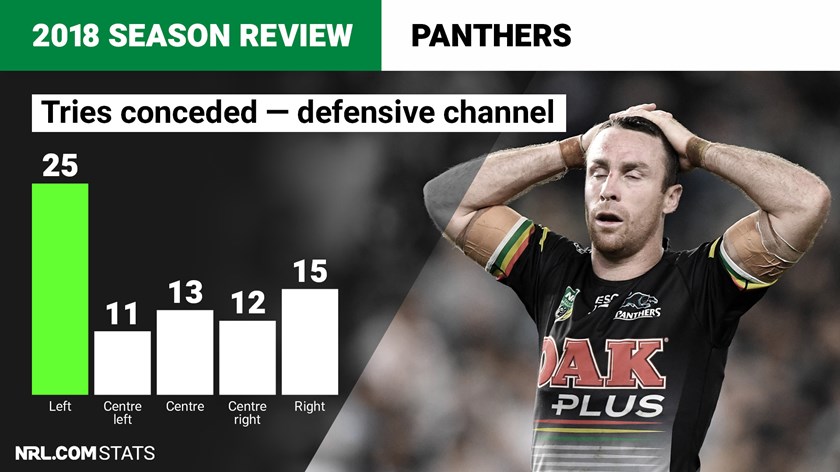 The Panthers' slow starts in 2018 resulted in 39% of their tries being scored in last 20 minutes of matches. Their top try scorers in Blake (12), Peachey (9) and Mansour (8) were potent down the left and centre-left channels where 55% of their tries were scored.