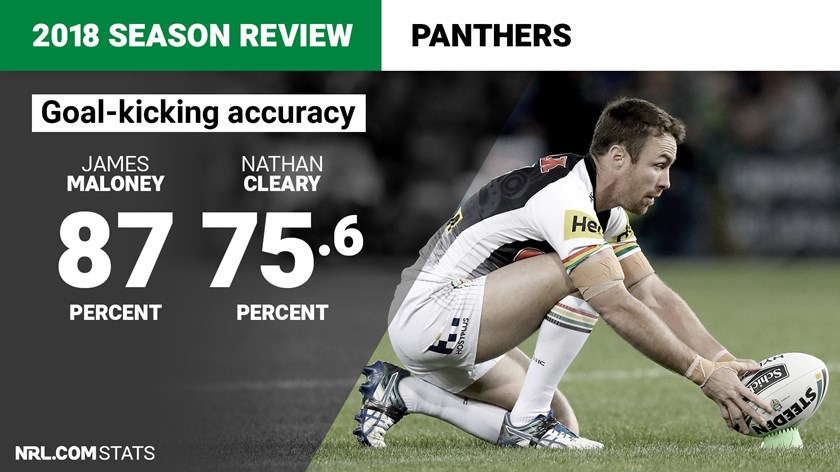 Kicking a total of 92 goals out of 113 attempts placed Penrith fourth in the NRL behind the Bulldogs, Broncos and Storm. Maloney converted 30 goals from 38 attempts and 23 penalty goals from as many attempts, while Cleary slotted 27 conversions out of 36 attempts and only missed one of his five shots at a penalty goal.
