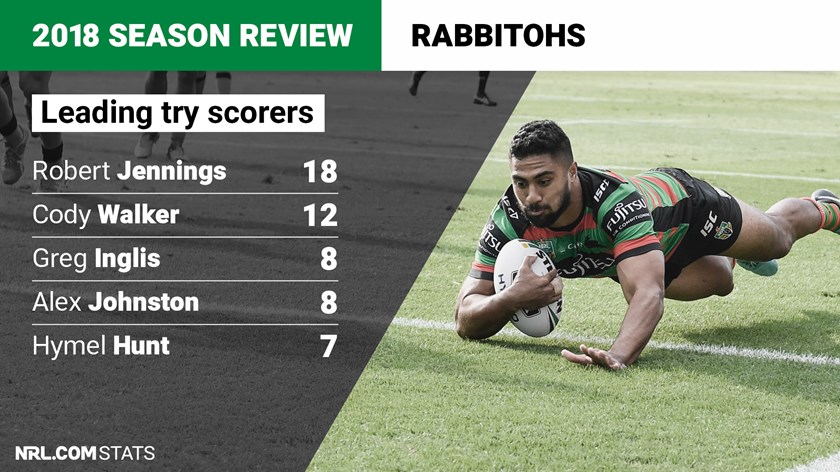 He topped their try count in attack but in defence Robert Jennings (14) ranked second only to Dane Gagai (15) for most tries causes. The Bunnies conceded 73 tries with an average of three tries per game and 49% were conceded down the right or centre-right channel, with 37% down the left or centre-left channel.