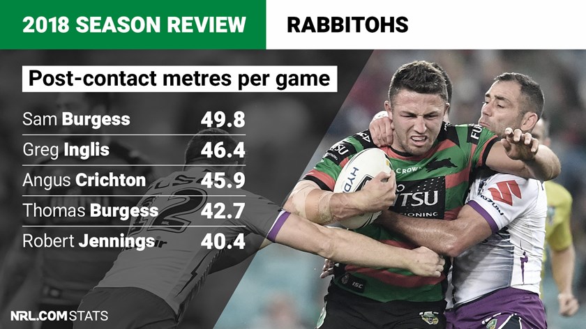 Bunnies enforcer Sam Burgess lead the charge with just under 50 post-contact metres per game, ahead of Inglis (46.4) and Crichton (45.9).