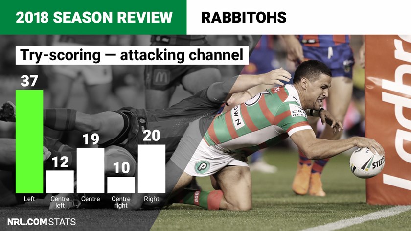 South Sydney scored a total of 98 tries in 2018, averaging 4.1 tries per game. Half of those tries were scored down the left or centre-left channel, while 31% were down the right or centre-right channel. The Bunnies also finished games strongly, scoring 31% of their tries in the last 20 minutes of matches.