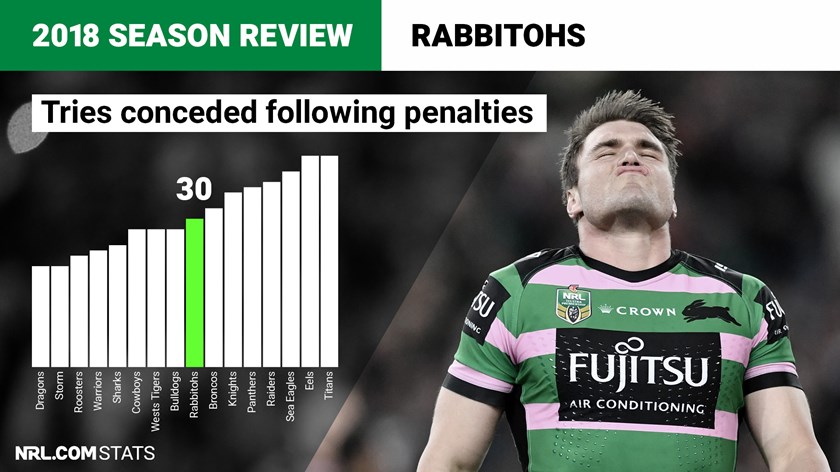 The Rabbitohs ranked eighth for most tries conceded following penalties with a total of 30. In this area of their game South Sydney weren't able to absorb the pressure as well as fellow top-four teams the Roosters (ranked 14), Storm (ranked 15) and Sharks (ranked 12). Angus Crichton was the most penalised player in the squad with 26, ahead of Sam Burgess with 25.