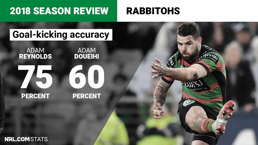 Kicking a total of 94 goals out of 129 attempts, the Bunnies missed out on 70 potential points through the season. Adam Reynolds slotted 55 conversion from 82 attempts and 29 penalty goals from 30 attempts, while Adam Doueihi kicked eight conversions from 14 attempts and was successful in the only penalty goal he kicked – the pair finished with a combined 78.23% success rate.