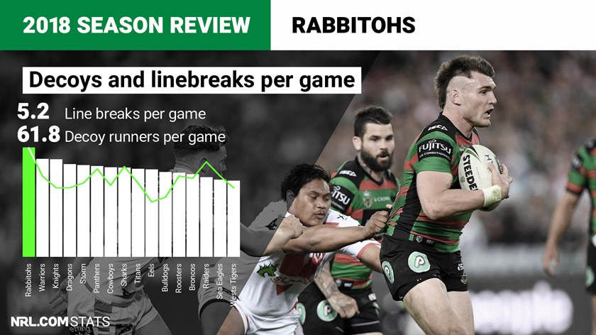 One aspect of South Sydney's game that couldn't be faulted was their effort in supporting their teammates. They led the competition for most effective decoy runs (61.8) and line breaks (5.2) per game.