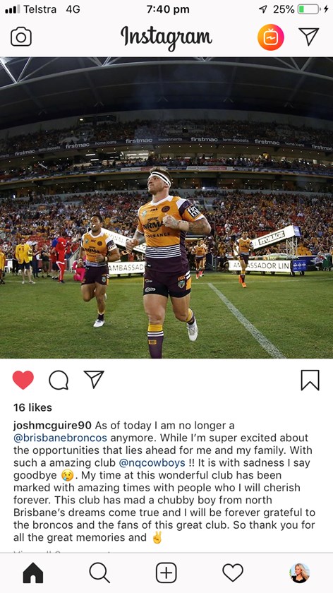 "As of today I am no longer a @brisbanebroncos anymore. While I'm super excited about the opportunities that lies ahead for me and my family. With such a amazing club @nqcowboys !! It is with sadness I say goodbye 😢. My time at this wonderful club has been marked with amazing times with people who I will cherish forever. This club has made a chubby boy from north Brisbane's dreams come true and I will be forever grateful to the broncos and the fans of this great club. So thank you for all the great memories and ✌️"