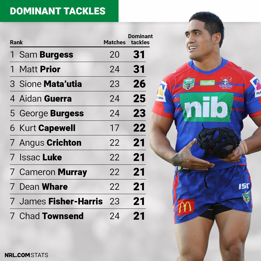 Mata'utia also racked up 26 'dominant' tackles through the season – the third most of any player and easily the most of any back, trailing only hard-hitting middle forwards Sam Burgess and Matt Prior (both 31).