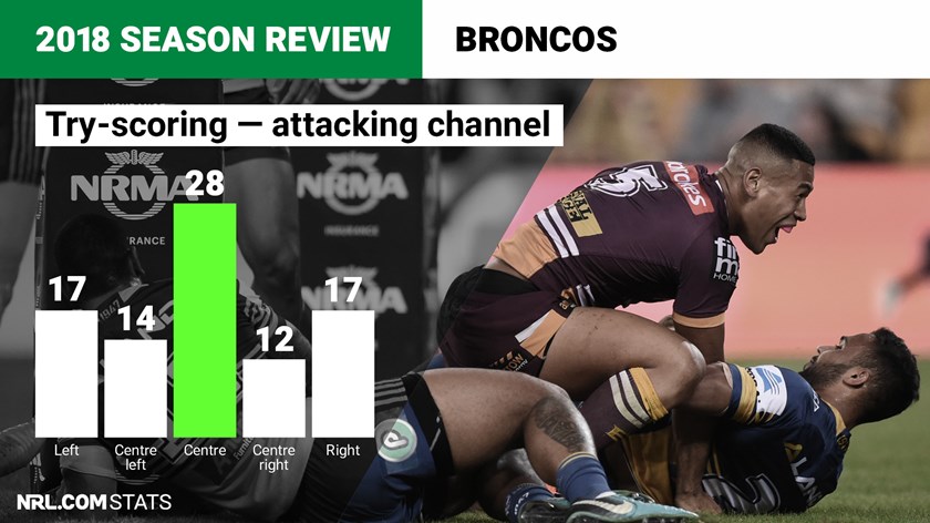 The Broncos defence was often caught short on the edges with 45% of the 80 tries they let in for the season conceded down the right or centre-right channel and 31% down left or centre-left.