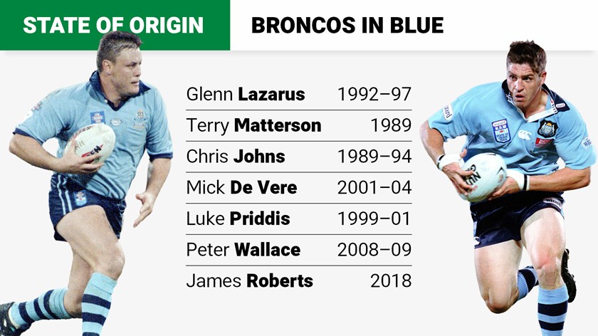 In the Broncos 30-year history only seven players have represented NSW at Origin level while playing for the club – Glenn Lazarus, Terry Matterson, Chris Johns, Mick De Vere, Luke Priddis, Peter Wallace and James Roberts.