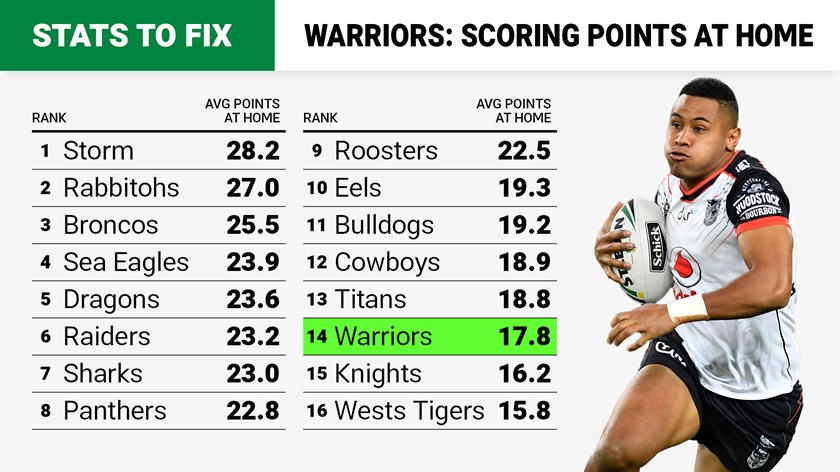 However, across the season, their overall home record was worse than some teams that missed the eight, including wooden spooners Parramatta who averaged more points scored at home with one more with (6-6) than the Warriors, while their average points scored was third-worst.