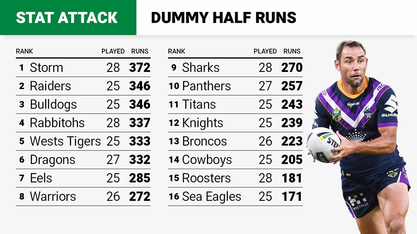 Smith is also responsible for Storm leading the NRL in 2018 in dummy-half runs, or 372 overall to be exact, almost 20 better than the Rabbitohs (356).