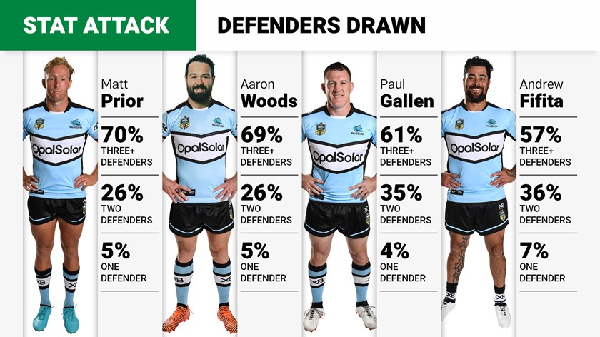 Cronulla's imposing pack had defences on high alert more than any other last season, with four of their big men drawing three or more tacklers with the majority of their carries. Prior (70%), Aaron Woods (69%), Paul Gallen (61%) and Fifita (57%) all ranked among the top 25 middle forwards for drawing defenders, with no club represented as often as the Sharks.