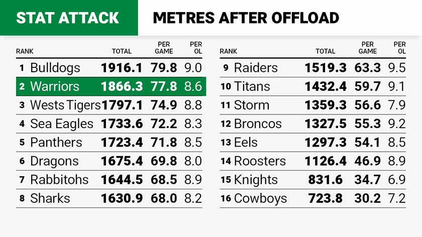 The Warriors made the most of any occasion they got their arms free in 2018, averaging 77.8 metres a game (second only to Canterbury) from their average of 13 offloads each outing last year. The likes Roger Tuivasa-Sheck, Adam Blair (both with 32 offloads), Jazz Tevaga (30) and Peta Hiku (29) were all particularly dangerous in the tackle, popping passes at a 94% effective rate or better.