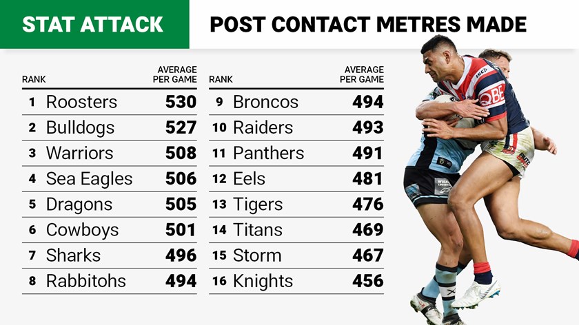 The Cowboys were sixth overall in the NRL for post-contact metres with 501m, a figure boosted by the performance of Jason Taumalolo who topped the competition with an average of 75.8 contact metres from 23 games.
