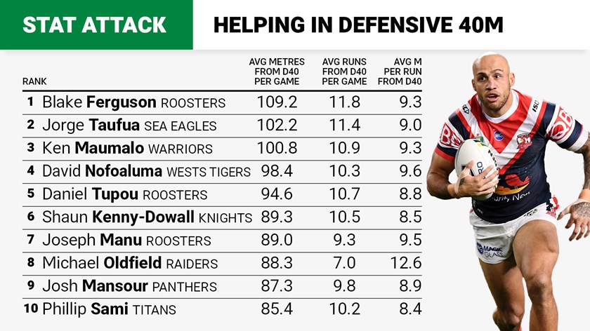 The Roosters' outside men did their share of heavy lifting and then some in the title tilt, with Ferguson (109 metres), Daniel Tupou (94.6) and Joey Manu (89) all ranking in the top 10 for metres made in their own 40-metre zone. Ferguson is of course now at Parramatta, but has been replaced by a couple of internationals in Hall and Morris.