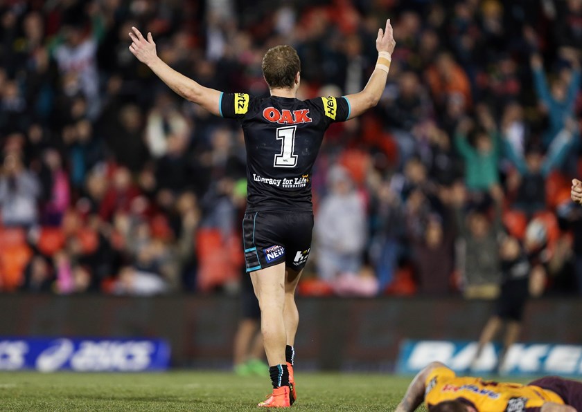 Penrith fullback Matt Moylan coolly pots a last-minute field goal to hand the Panthers a 35-34 win over Brisbane in one of the most entertaining contests of the season.