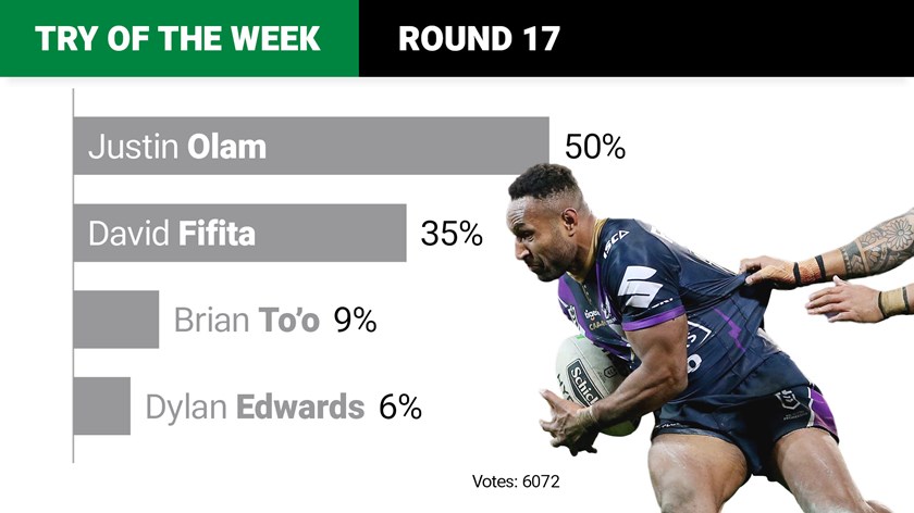 Storm centre Justin Olam's first NRL try has also landed him Try of the Week honours for Round 17.